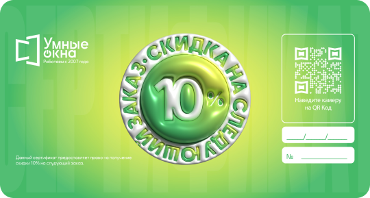 Скидка 10% на следующий заказ при повторном обращении. Выдается только по запросу. Не забудьте запросить его у замерщика при оформлении заказа.