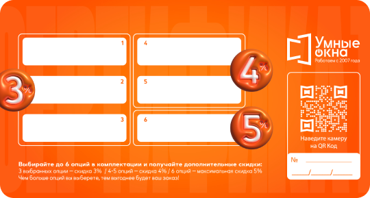 Дополнительная скидка в размере 3000 рублей на заказ окон. Можно получить в качестве «секретного приза» от замерщика.